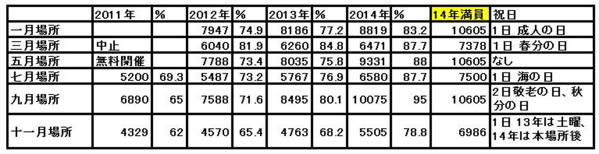 さすがに2011年の3場所は60%台しかお客は来なかった。